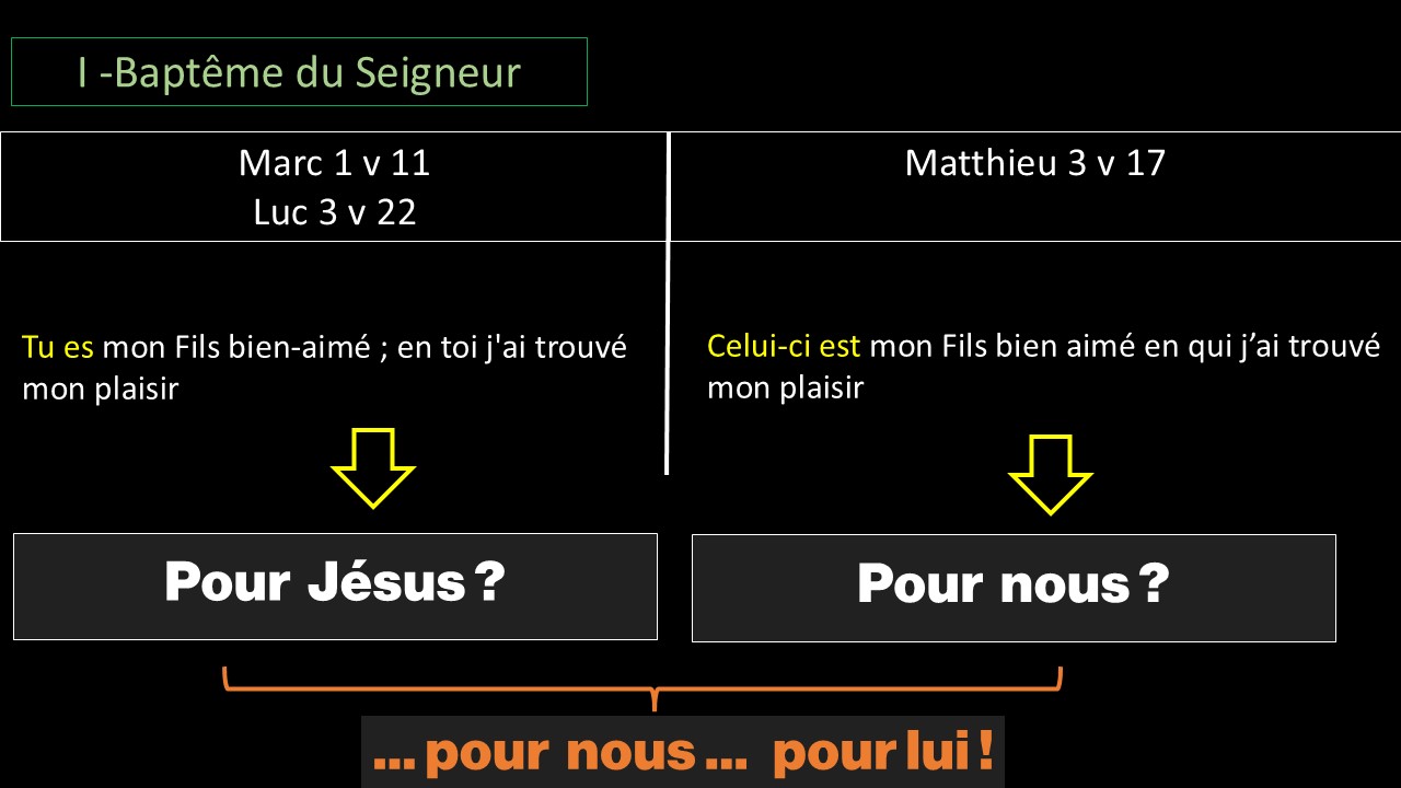 Pourtant la Bible ne se trompe pas. Dieu a parlé ! Certains l’ont entendu d’une façon, d’autres d’une autre. Chacun retranscrit avec son ressenti personnel. C’est la voix de Dieu qui touche les coeurs. Marc et Luc, les 2 évangélistes avaient besoin d’entendre que Dieu parlait à Jésus. Matthieu entend Dieu lui dire à lui-même, c’est bien LUI, le Fils bien-aimé ! C’est le cheminement du coeur auquel chacun doit répondre pour lui-même.